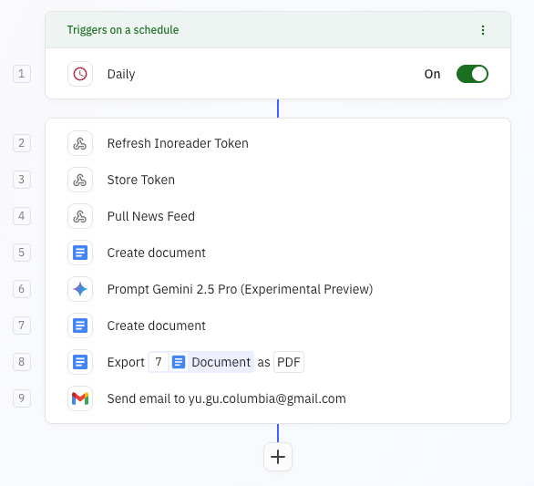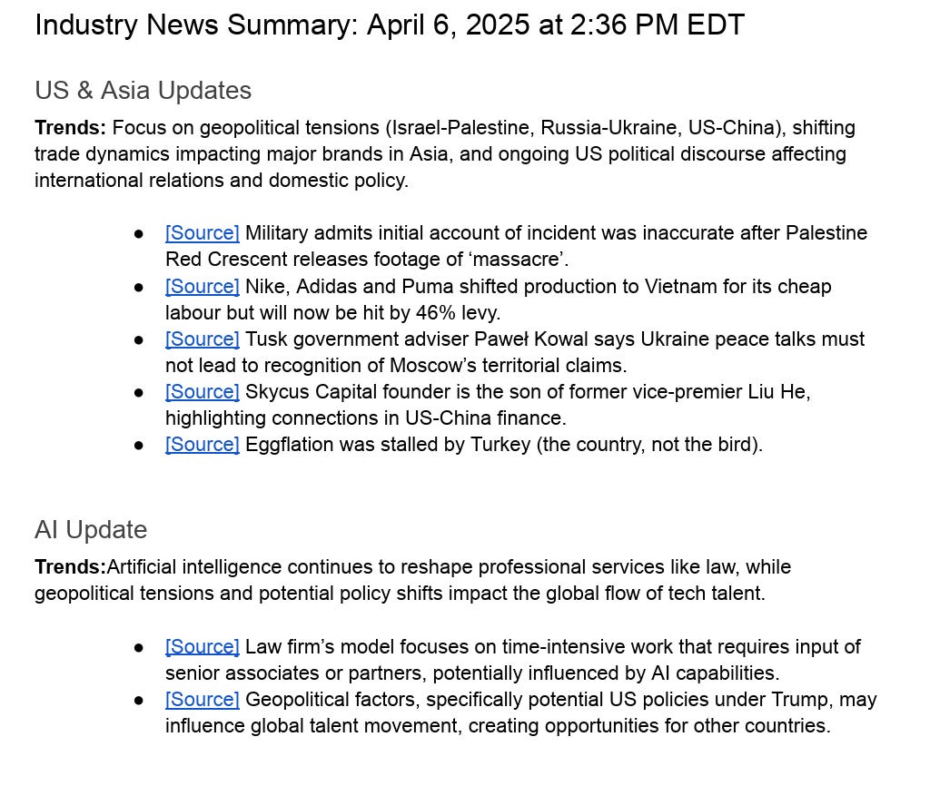 Summarize the news - this step is really simple 2. I bundled all the news I pulled, with some prompts for summary and and instructions for a json output. Gemini 2.5 pro does the job nicely. Most importantly, Gemini API is Free.