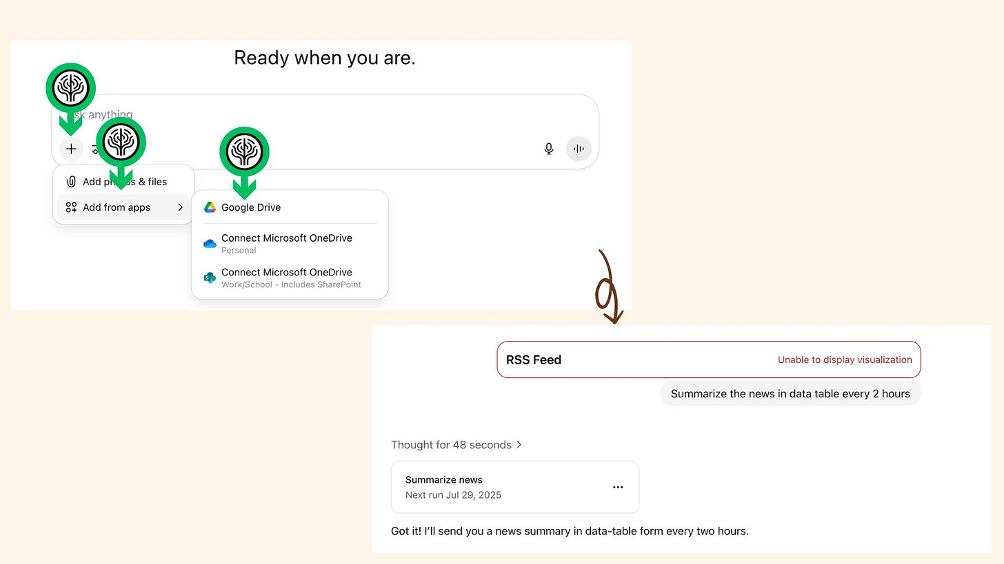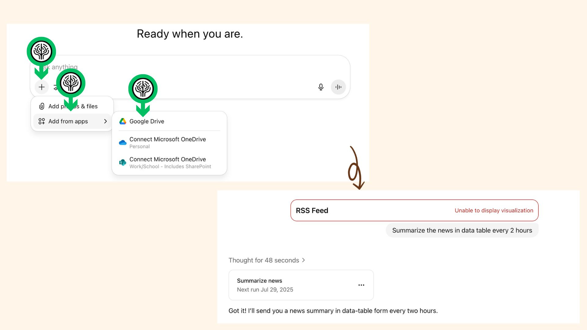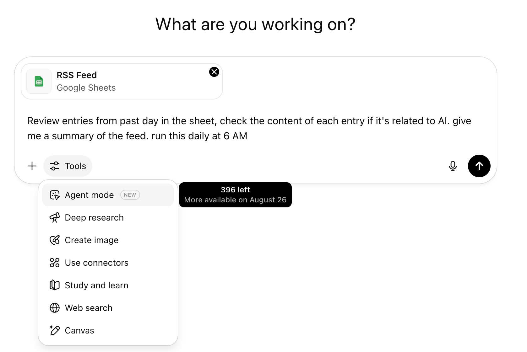 Once you got your data connected, you can simply schedule a task the summarizes the news/articles etc for you! (remember to add web search for the task). And while you are doing this, be sure to use O3 to do the summary and search. Combing through a google sheet is not a task for 4o.