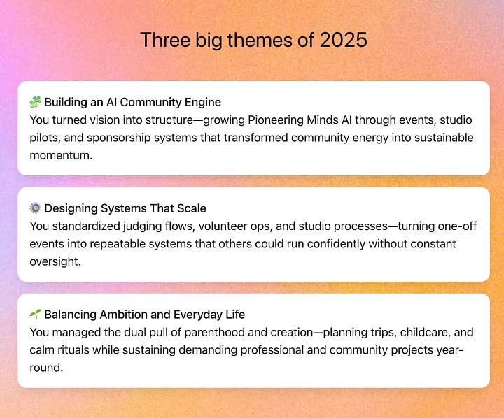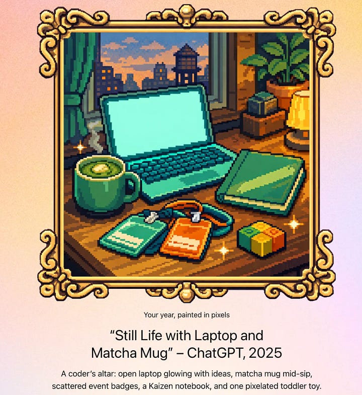 Now, did you get the year-in-review from ChatGPT? I sure got mine! It reminded me of something true: AI isn’t a tool I “use sometimes” anymore. It’s part of how I learn, plan, and build. It has become part of how I live.