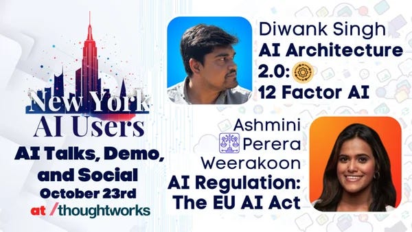 Wednesday, Oct 23, 19:30 - 22:30 EDT | NYC AI Users - AI Talks, Demo & Social: AI Regulation and Architecture. Hosted by New York AI Users. Event Link