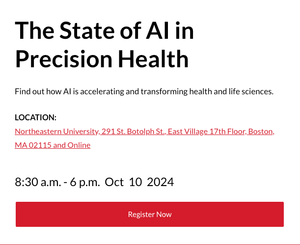 Thursday, Oct.10 08:45-18:00 | The State of AI in Precision Health. Hosted by Northeastern University. Hybrid. Link