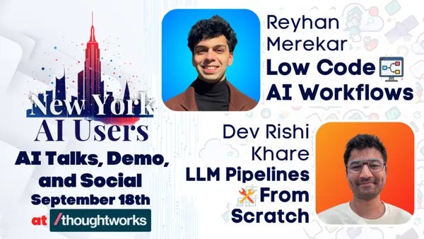 Wednesday, September 18, 2024 7:00 PM - 10:30 PM EDT | NYC AI Users - AI Talks, Demo & Social: Low/No Code AI and LLM Pipelines. Hosted by NYC AI Users. Event Link