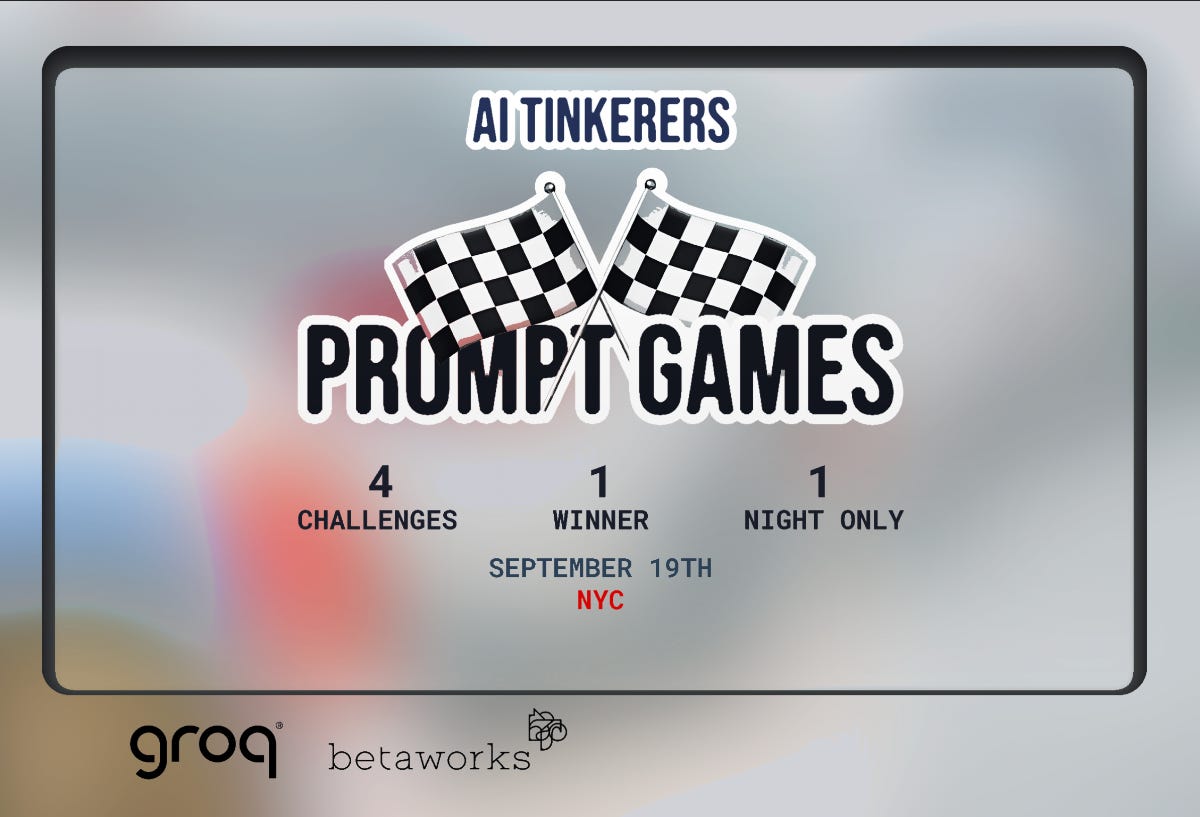 Thursday, September 19, 2024 6:00 PM - 9:00 PM EDT | Prompt Games: A Night of Engineering Challenges. Hosted by AI Tinkerers. Event Link