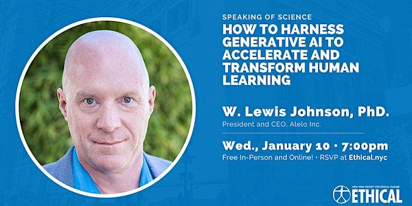 Jan.10 19:00-20:30 EST | Lewis Johnson: How to Harness Generative AI to Transform Human Learning. Hosted by New York Society for Ethical Culture. In-Person/Zoom RSVP.