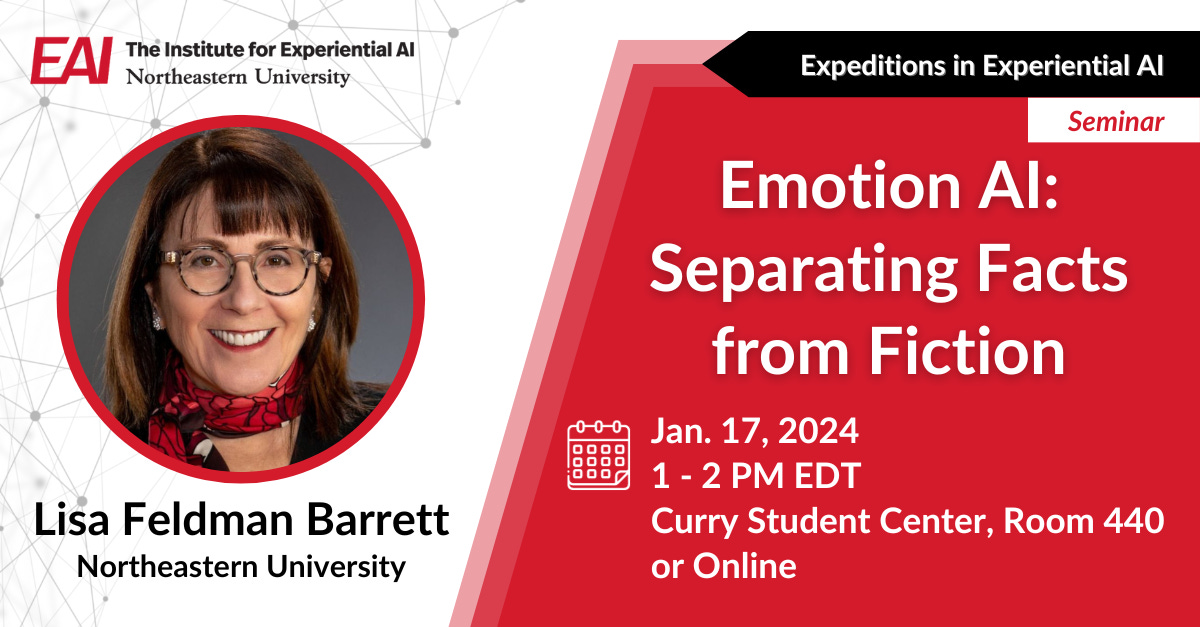Lisa Feldman Barrett will kick off our Spring 2024 Seminar Series on Wednesday, Jan. 17, 2024 at Northeastern University’s Curry Student Center. In her Expeditions in Experiential AI Seminar “Emotion AI: Separating Facts from Fiction,” Lisa will discuss her revolutionary research in psychology and neuroscience, as well as a radically new scientific understanding of what emotions are, how they work, and implications for emotion AI efforts. Register for free to join us in-person or online!