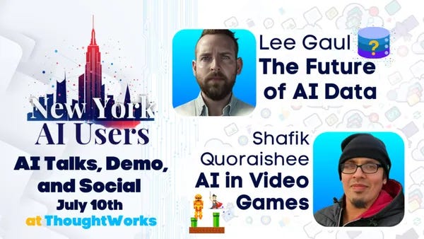 Jul.10 19:30-22:30 EDT | NYC AI Users - AI Talks, Demo & Social: Future of AI Data and AI Video Games. Hosted by David Cunningham @ New York AI Users. In Person RSVP.