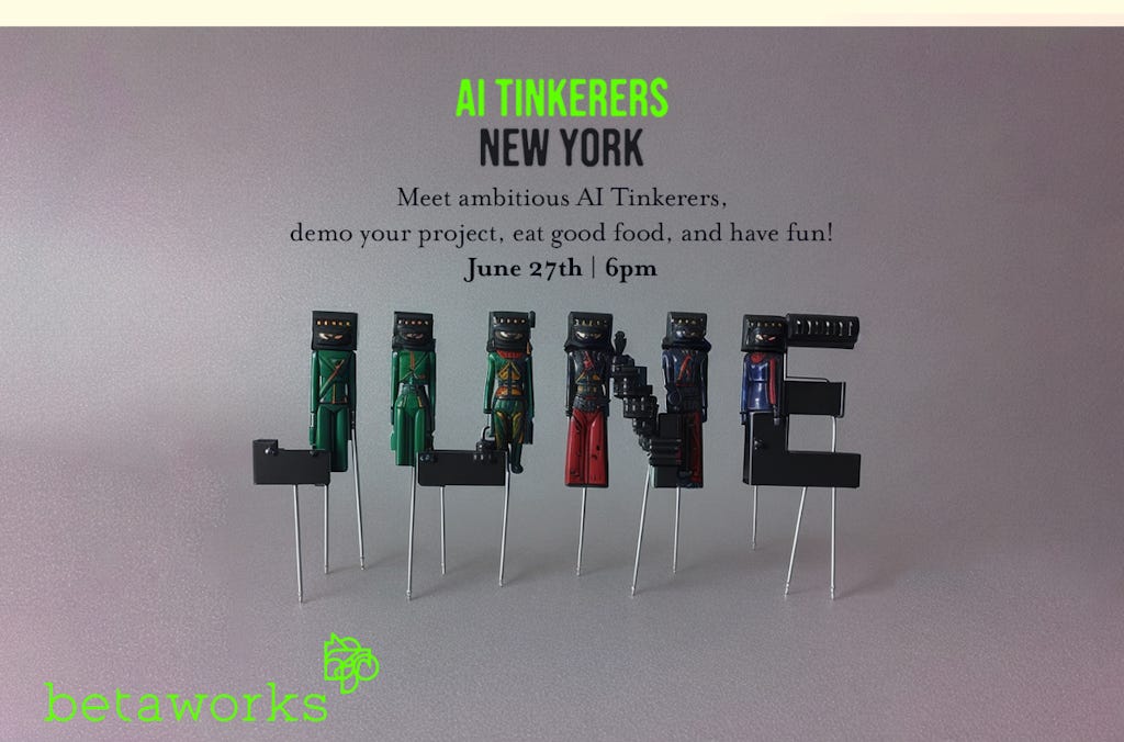 Jun.27 18:00-21:00 EDT | AI Tinkerers June Meetup at Betaworks! In Person RSVP.